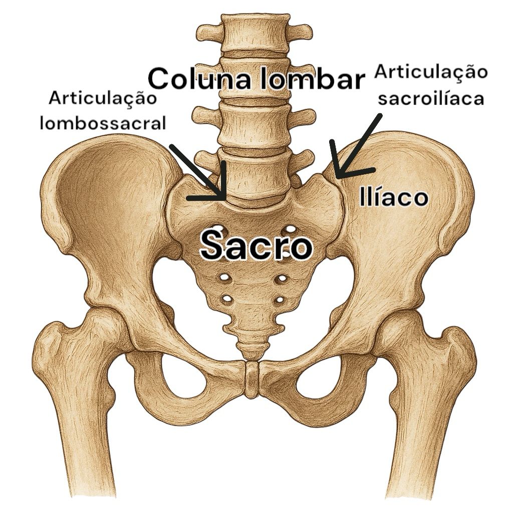 O sacro é um osso triangular localizado na base da coluna vertebral, articulando-se com a última vértebra lombar (L5) e com os dois ossos ilíacos, formando a articulação sacroilíaca. Essa região é fundamental na transmissão de cargas entre a coluna e os membros inferiores, além de desempenhar papel importante na estabilidade postural.